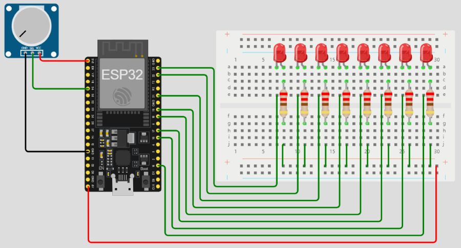 - 當調整可變電阻時,由8個LED燈亮的數目(全滅←→1個燈←→2個燈←→ …… ←→8個燈),線性對應目前可變電阻所處的位置。