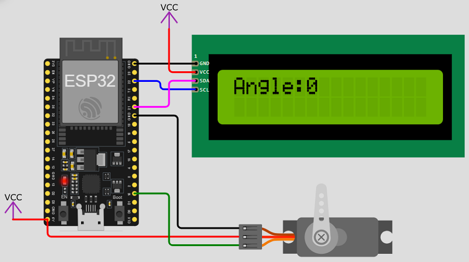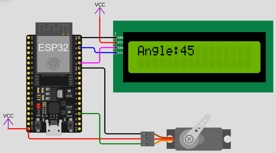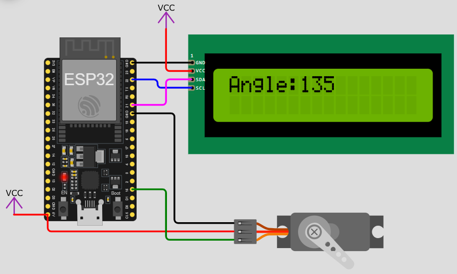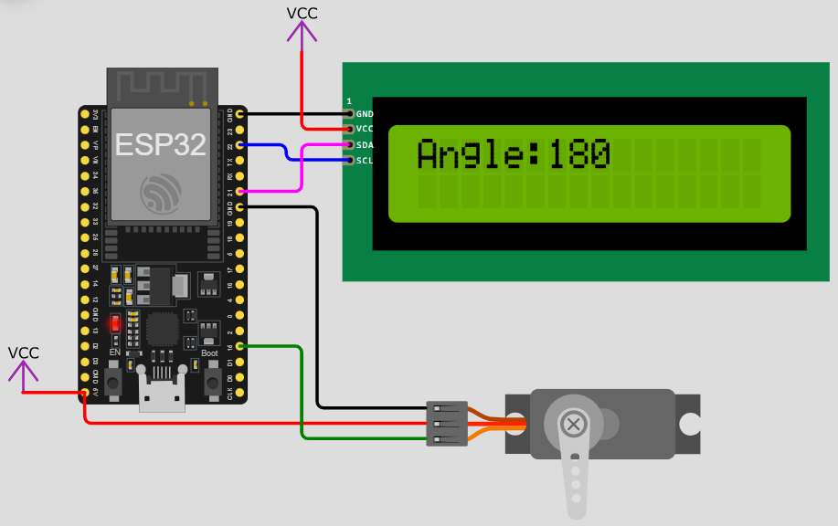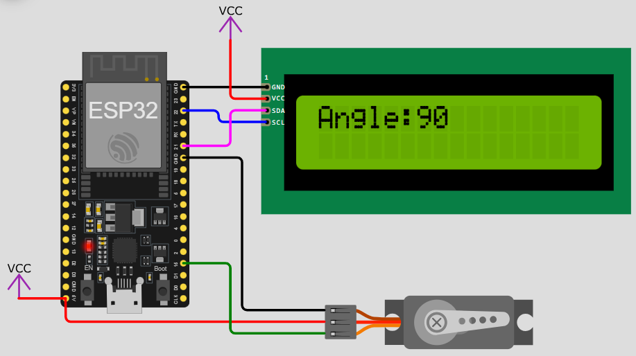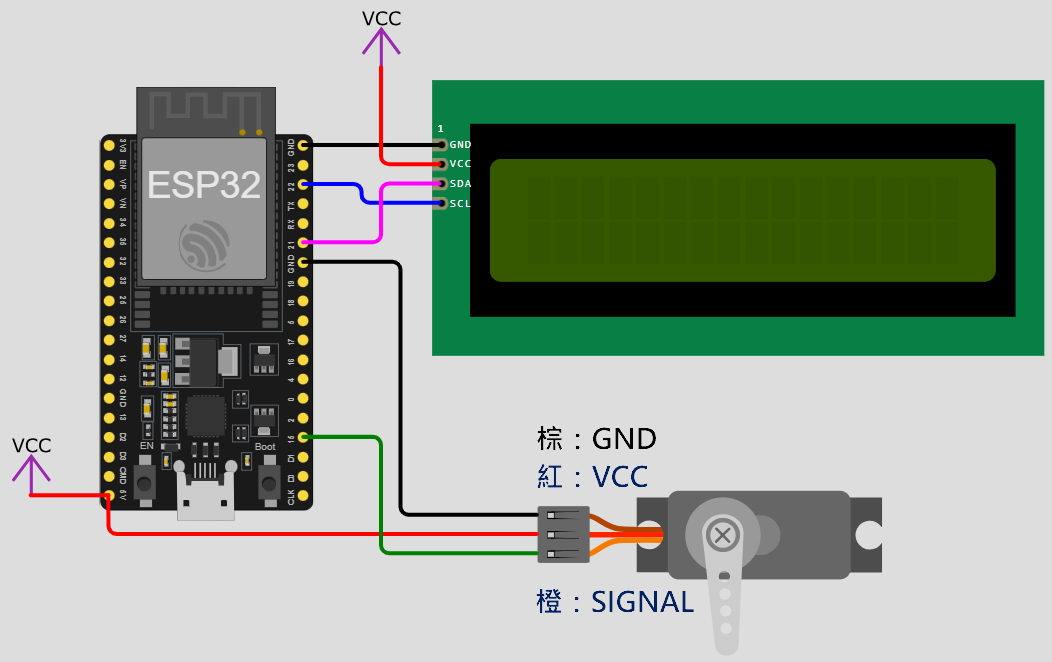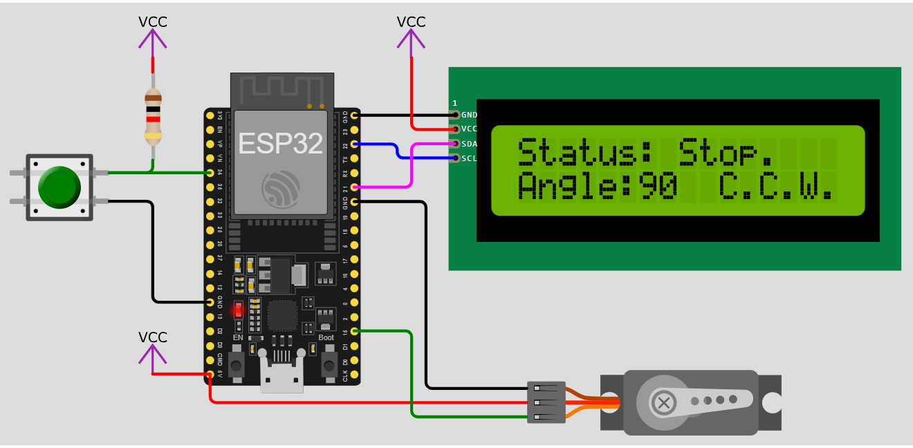1.本試題使用ESP32微控制器、1602 I2C LCD顯示器、SG90伺服馬達及外接按鈕開關,由按鈕開關控制伺服馬達的啟動、停止及改變旋轉方向,由LCD顯示器呈現受控狀態。參考接線如附件電路圖。