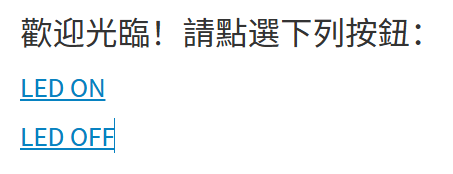 String html ="<h1>歡迎光臨!請點選下列按鈕:</h1> <h2><a href=\"/on\">LED ON</a></h2> <h2><a href=\"/off\">LED OFF</a></h2>";