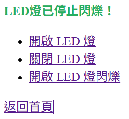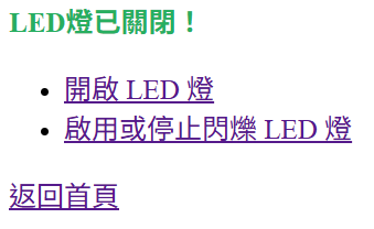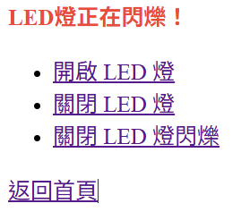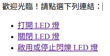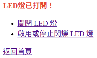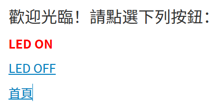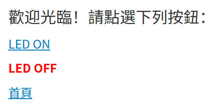 String html ="<h1>歡迎光臨!請點選下列按鈕:</h1> <h2><a href=\"/on\">LED ON</a></h2> <h2><span style=\"color:#ff0000\"><strong>LED OFF</strong></span></h2> <h2><a href=\"/\">首頁</a></h2>";