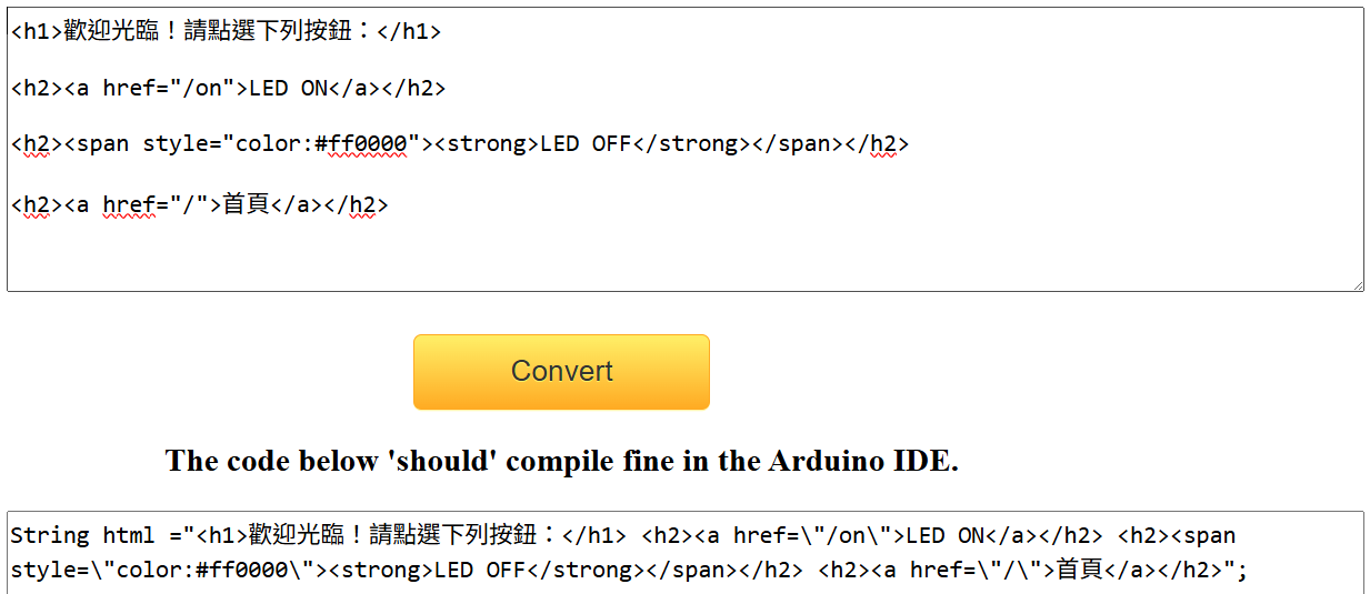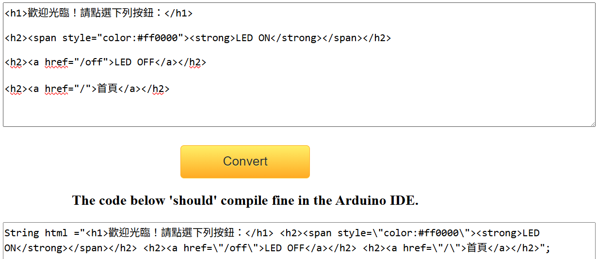String html ="<h1>歡迎光臨!請點選下列按鈕:</h1> <h2><span style=\"color:#ff0000\"><strong>LED ON</strong></span></h2> <h2><a href=\"/off\">LED OFF</a></h2> <h2><a href=\"/\">首頁</a></h2>";