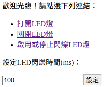 現在要在原有的網頁上,增加一個「訊息方塊」讓使用者可以輸入閃爍時間的數值,以及一個「按鈕」,送出後可以決定LED閃爍的時間間隔。