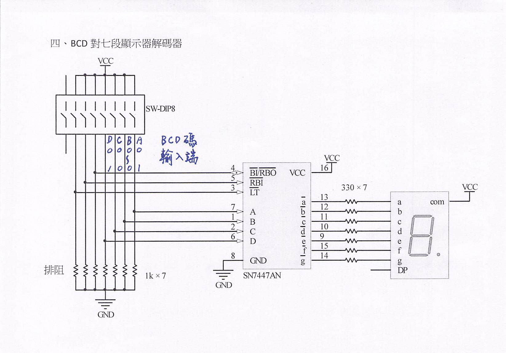 BCD對七段顯示器解碼 2025-11-052025-11-05 hanmin 若七段顯示器改成共陰極,則須將解碼IC更換為7448,並將輸出端上拉電阻(pull up)到VCC位置,以確保解碼IC具有足夠的輸出驅動電流。 參考接線 7447 + 共陽極七段顯示器 7448 + 共陰極七段顯示器 參考影片
