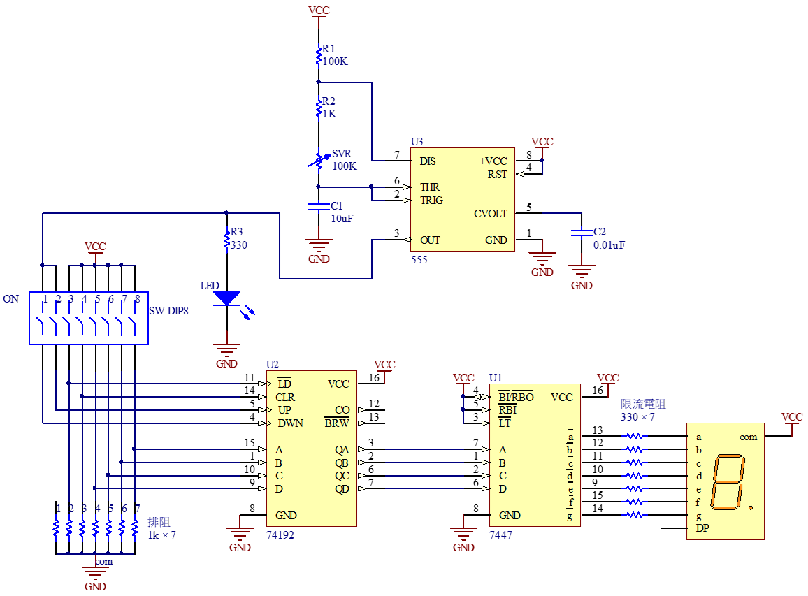 555的工作電壓可在4.5V到15V之間,本次實習VCC設定為5V,並以無穩態模式操作,輸出的連續方波作為74192上下數計數器的時脈(clock)輸入。