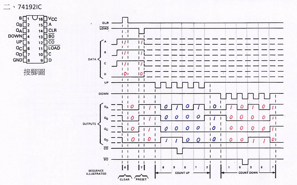 - 下數(DOWN):74192會從當前值開始遞減,每次時鐘脈衝到來時,計數器的值減少 1。