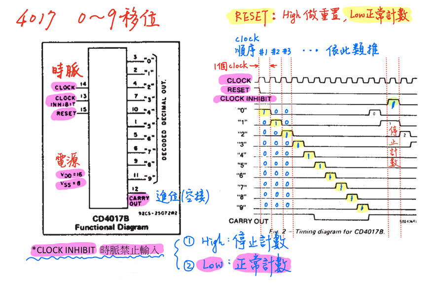 4017 IC:是一種10進位計數器,每個時脈的變化,會使輸出接腳輪流產生高態,並形成循環。此IC具備重置、進位輸出及禁止計數等功能。