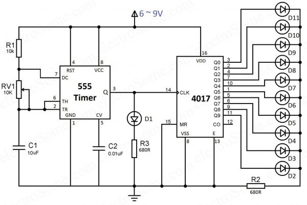 參考應用電路(資料來源:https://electrosome.com/led-chaser-ic-4017-ic-555/)
