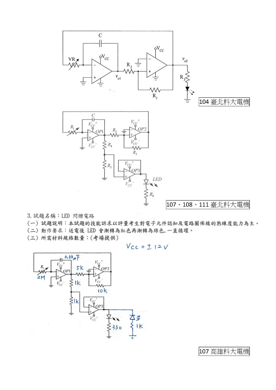 【作業練習】107、108、111臺北科大電機實作試題,VCC=±12V,R1=100kΩ,C=10μF,R2=20kΩ,R3=47kΩ,R4=1kΩ,R5=1kΩ。